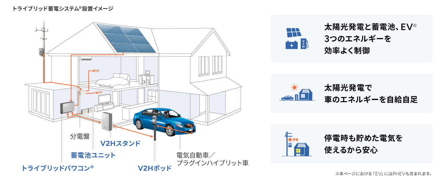太陽光発電や電力会社からの電気をEV(電気自動車)にため、