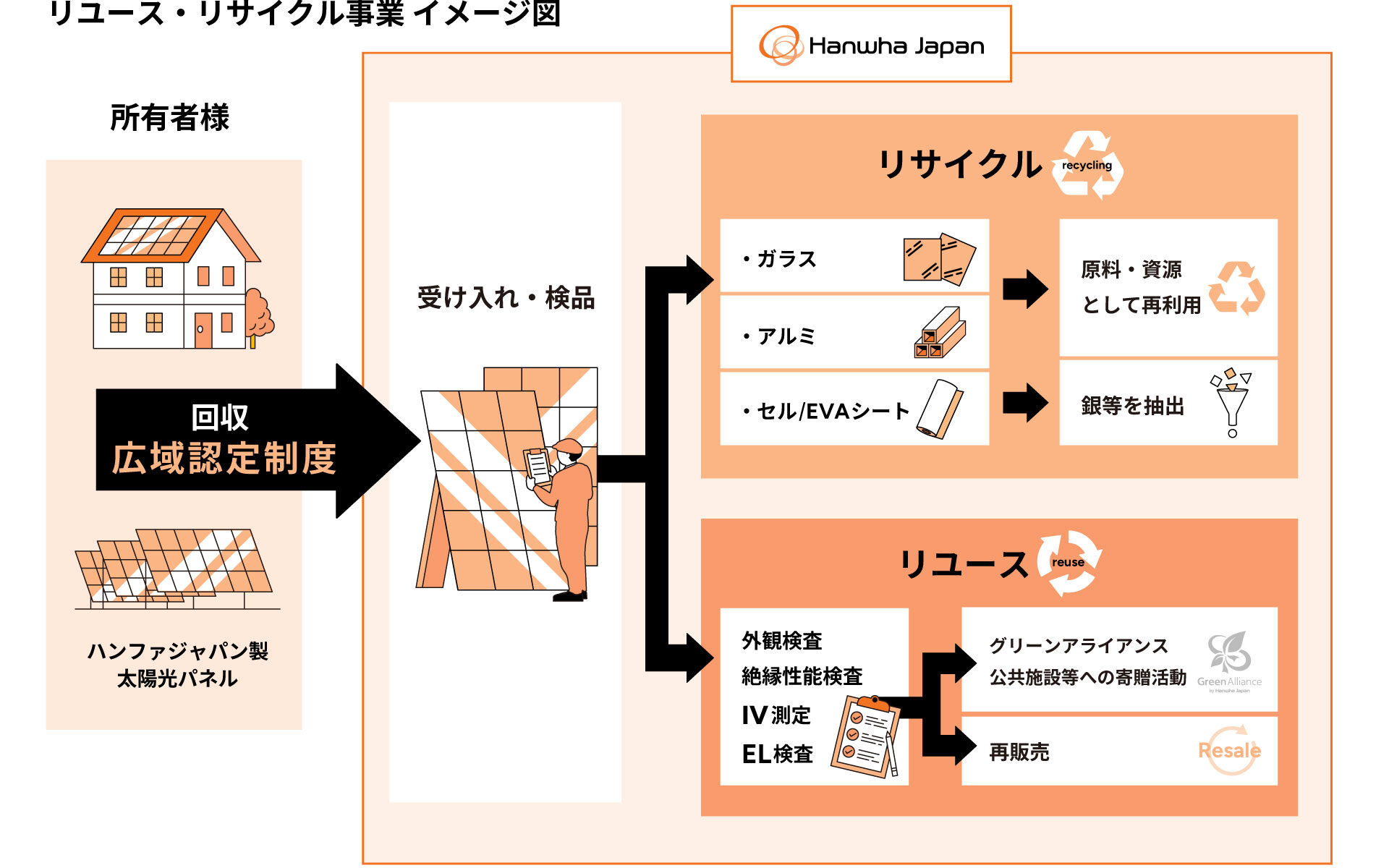 このたびの太陽光パネルのリユース・リサイクル事業は、太陽光パネルメーカーの広域認定制度※³を活用し、ハンファジャパン製の使用済み太陽光パネルの回収から適正処理までを一貫して行うサービスを提供予定です。本制度に基づきメーカーが一括で取りまとめることで、ご購入者の皆様は個別に収集業者やリサイクル業者を探す手間が省け、不法投棄などのリスクを回避し、安心して回収処分をお任せいただけます。また、全国的なネットワークを構築することにより、効率的な回収・処理体制を実現し、コスト削減にも繋がります。