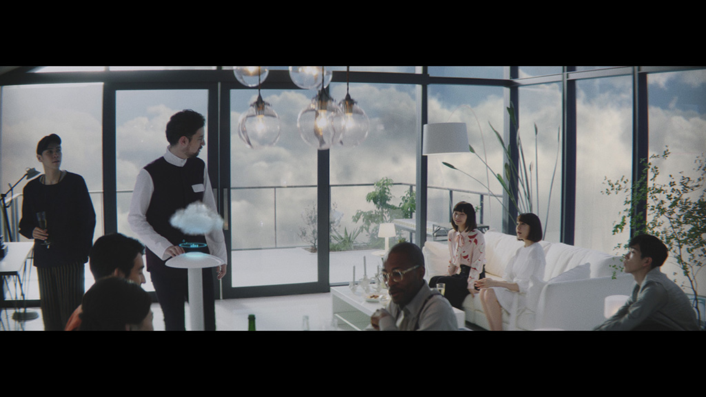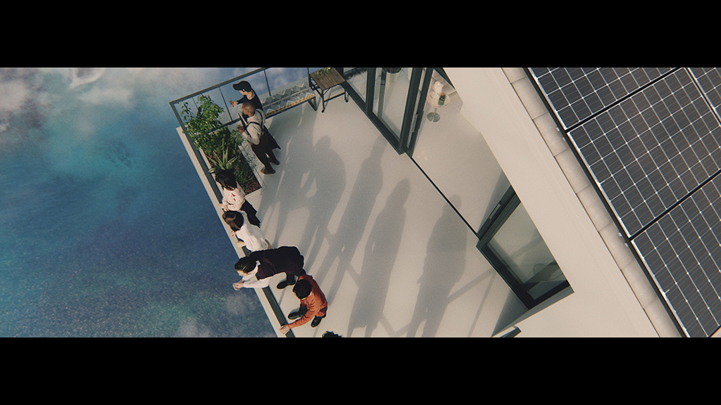 時は近未来。Qセルズの太陽電池モジュールでエネルギーを賄う“空飛ぶソーラーハウス”で、若者たちがホームパーティを楽しんでいます。トリンドルさんはそんなソーラーハウスに招待された一人。家の持ち主である男性が、近未来型HEMS(発電モニターシステム)を操りながら、「今日はすこし雲が多いねぇ」と話します。トリンドルさんは、厚い雲が広がる空の中を進み続ける、太陽光パネルの発電パワーに感動。トリンドルさんと若者たちが外へ出ると、ソーラーハウスはついに雲を抜け、一面に海を見渡します。「曇りでも力強く発電」する秘密の答えを、「答えは、Q。」のキャッチコピーで表現しています。