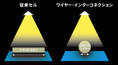 フラットリボンの代わりにラウンドワイヤ―をバスバーに採用することで、電極の幅と合わせて影の影響を受ける部分が75%削減され、出力が向上します。さらに、ラウンドワイヤ―による反射光の効果で太陽電池モジュールの光の活用度を高めます。