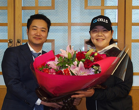 • 本社を訪問したイ・ミニョン選手(右)に花束を贈呈