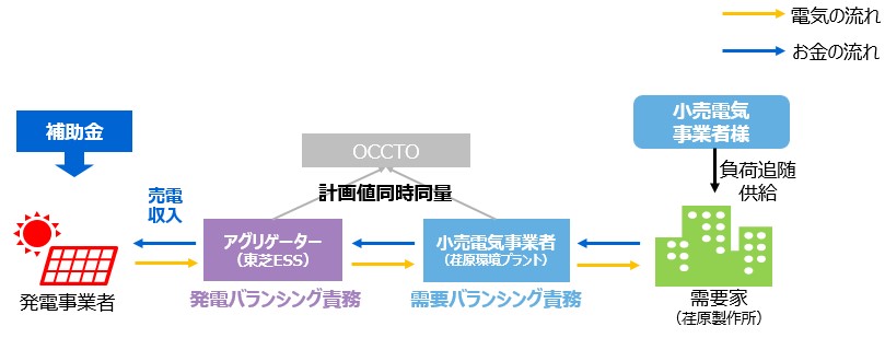 本事業は、2023 年 3 月までに千葉県に建設予定の 3MW の非 FIT オフサイト太陽光発電所から発電される電力を、アグリゲーターである東芝 ESS が再エネ発電 BG(注1)を構成した上で買い取り、小売電気事業者である荏原環境プラントを通じて、需要家である荏原製作所に環境価値とともに電力を供給するものであり、その建設費用の一部に対し補助金が支給されます。