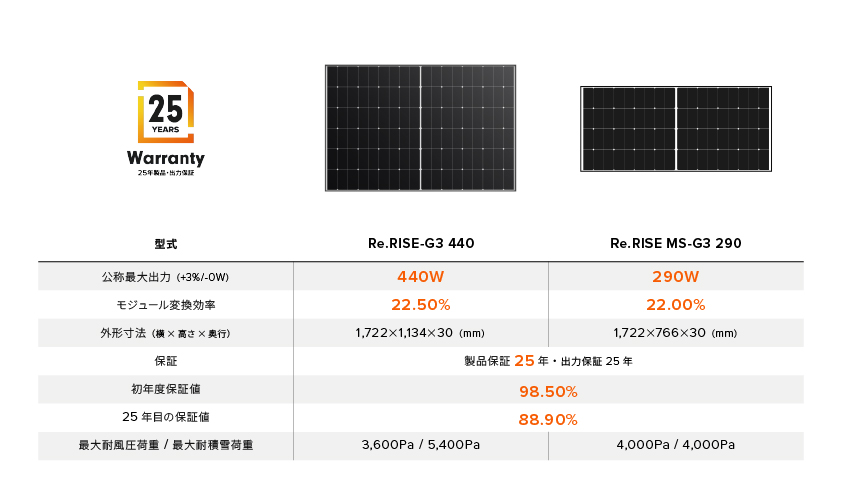 この度の新製品「Re.RISE-G3」シリーズは、通常、太陽電池モジュール表面に配置する電極(バスバー、フィンガー)を裏面に集約して光の吸収効率を最大限に高める「バックコンタクト技術」の採用により、変換効率は最大22.5%、出⼒は最⼤440Wを達成いたしました。バックコンタクトセルは、受光面に配線がなくなることで配線の影による発電ロスが無くなり、太陽の入射角が低い朝や夕方、曇天時などの低照度環境においても安定した発電性能を維持します。なお、再生可能エネルギー製品の安全性・長期信頼性の評価を目的とした試験を行う機関「RETC(Renewable Energy Test Center, LLC)」による、代表的な11の個別試験項目をすべてクリアし、性能と信頼性が認証されています。この裏付けにより「Re.RISE-G3」シリーズは、製品保証25年、出力保証25年の長期保証を実現いたしました。