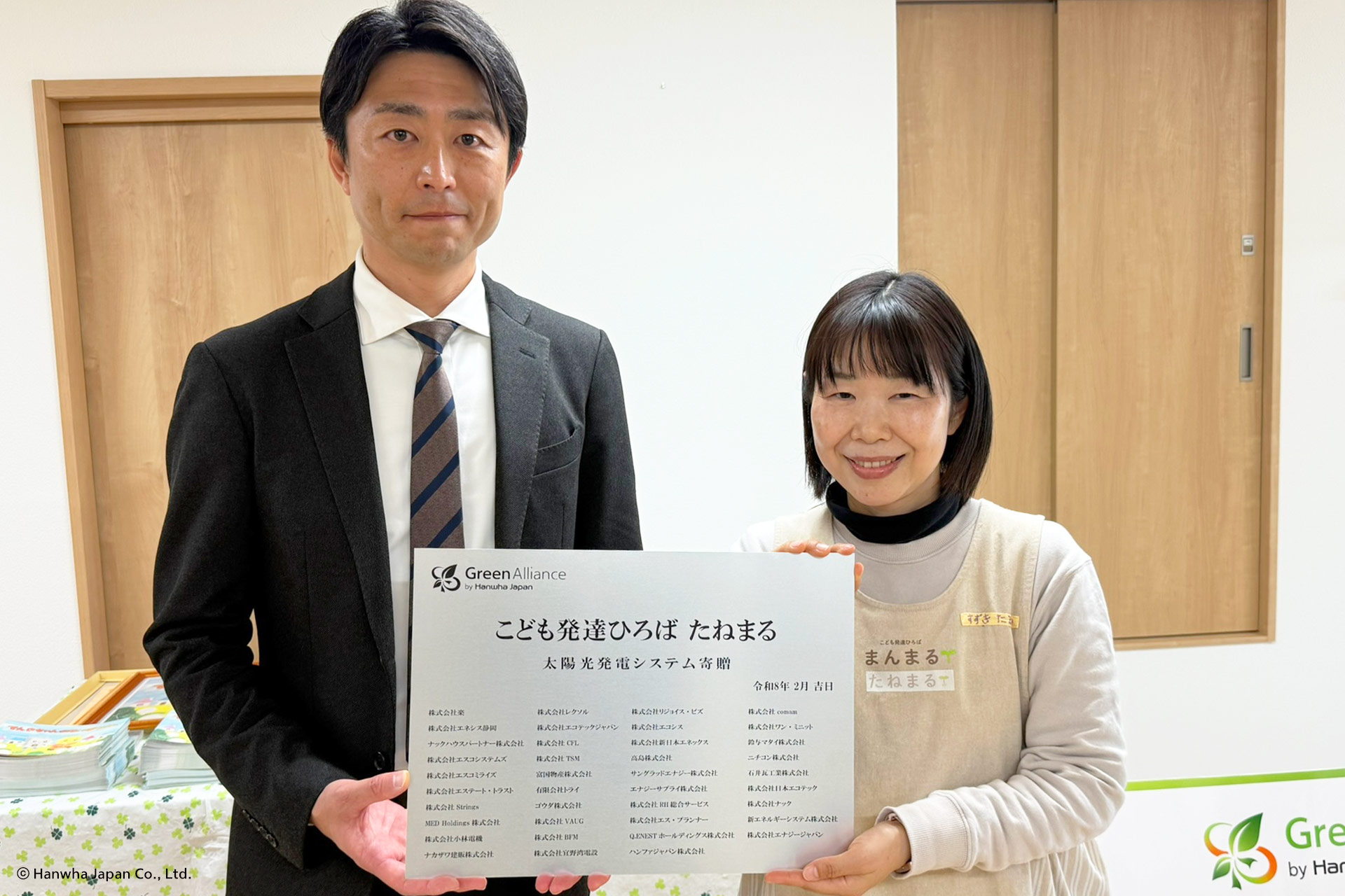 ハンファジャパン株式会社(所在地:東京都港区 代表取締役:張 熙載 以下、当社)が主宰するSDGsパートナーシップ制度「Green Alliance(グリーンアライアンス)」は、こども発達ひろば「たねまる」(所在地:静岡県静岡市、以下、たねまる)に対し、太陽光発電システム(発電容量11.2kW)を寄贈いたしました。