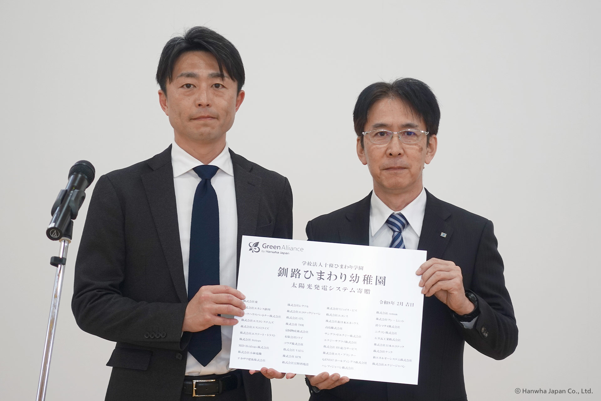 ハンファジャパン株式会社(所在地:東京都港区、代表取締役:張 熙載、以下「当社」)が主宰するSDGsパートナーシップ制度「Green Alliance(グリーンアライアンス)」は、北海道エリアに根ざしたパートナー企業である株式会社エコテックジャパン(北海道札幌市)と連携し、釧路市が掲げる指針「自然と再生可能エネルギーの調和」に則り、学校法人十條ひまわり学園 認定こども園 釧路ひまわり幼稚園(所在地:北海道釧路市)に対し、園内電力をまかなうための自家消費型の太陽光発電システム(発電容量:12.3kW)を寄贈いたしました。