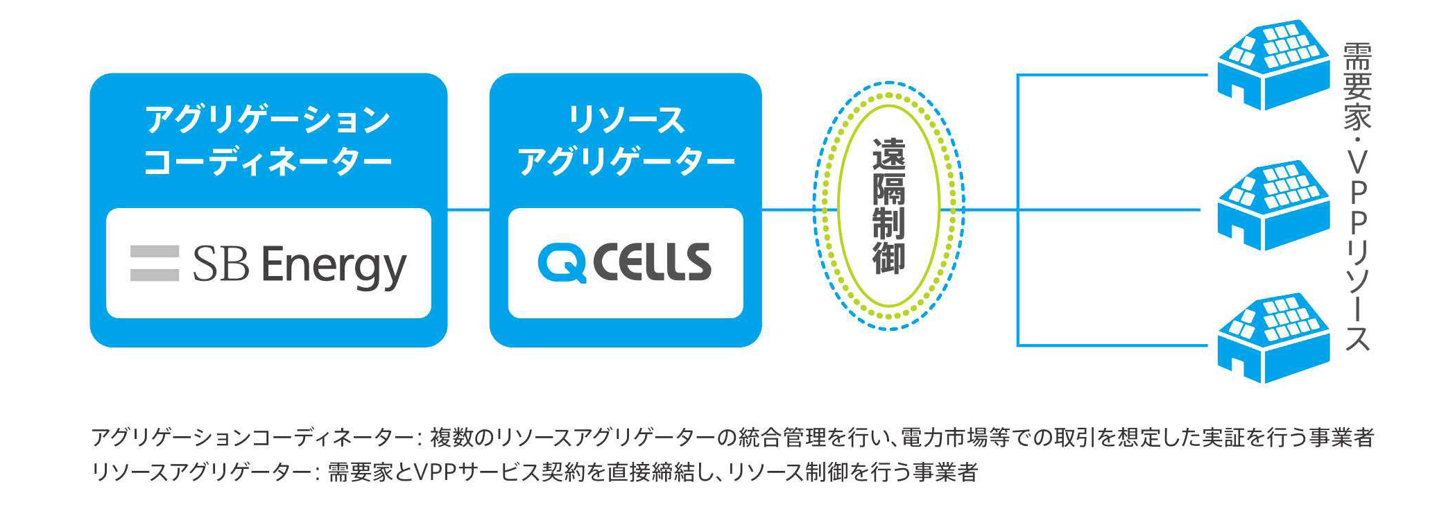 当社は、本実証事業において、アグリゲーションコーディネーター※2であるSBエナジー株式会社(本社:東京都港区、代表取締役社長:三輪 茂基、以下「SBエナジー」)と連携して、契約した一般家庭の蓄電システムに対して、エネルギーの遠隔制御および統合管理を行います。