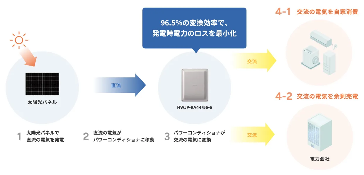 96.5%の高い変換効率により、太陽光パネルから発電した電力のロスを最小化します。