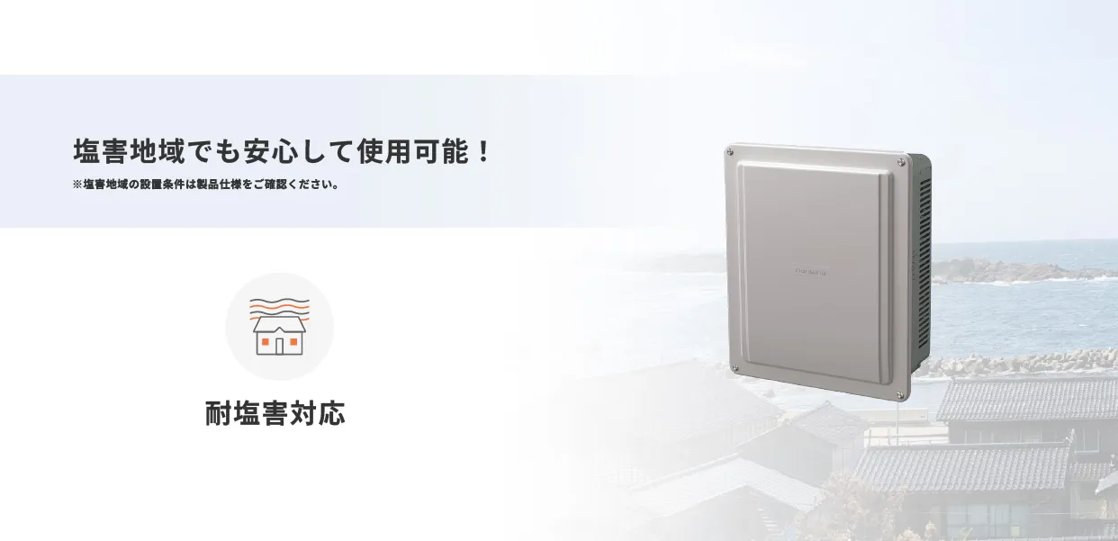 耐塩害仕様で、一般地域でも高い耐久性を発揮し、長く安心してご使用いただけます。※塩害地域の設置条件は製品仕様をご確認ください。