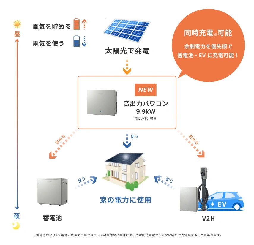 9.9kWの高出力パワーコンディショナで、蓄電池とEVの同時 放電・充電が可能です。