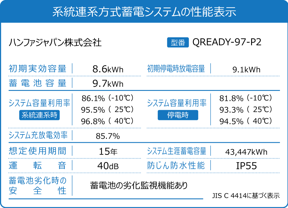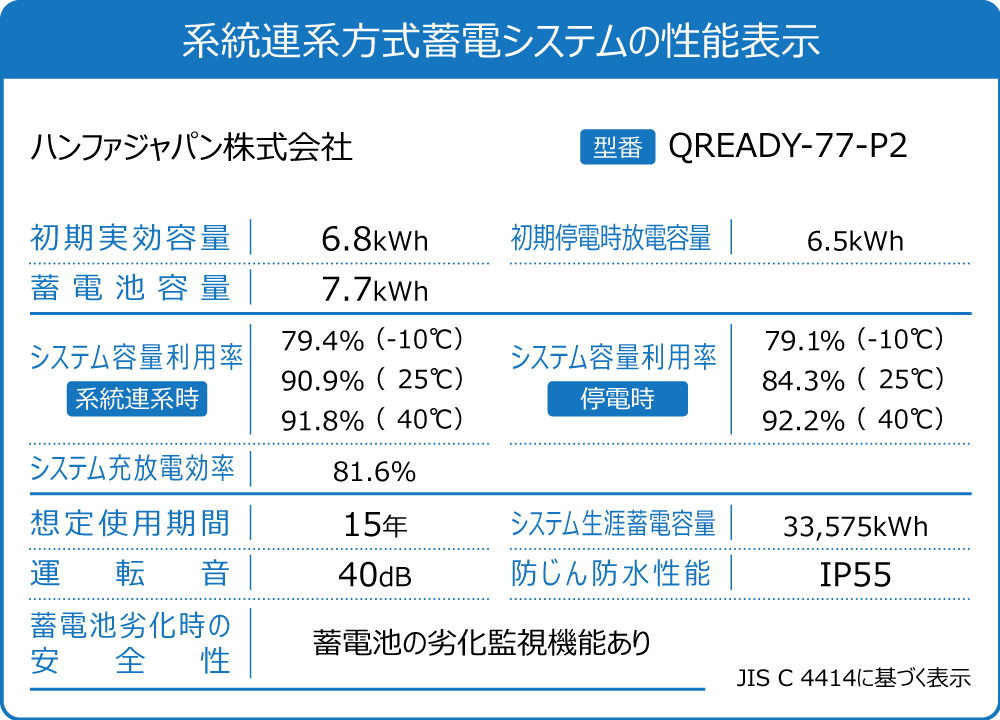 拡張型太陽光発電システムQ.READY®(ハイブリッド蓄電システム・V2Hシステム連携)の性能表示ラベルは以下のとおりです。